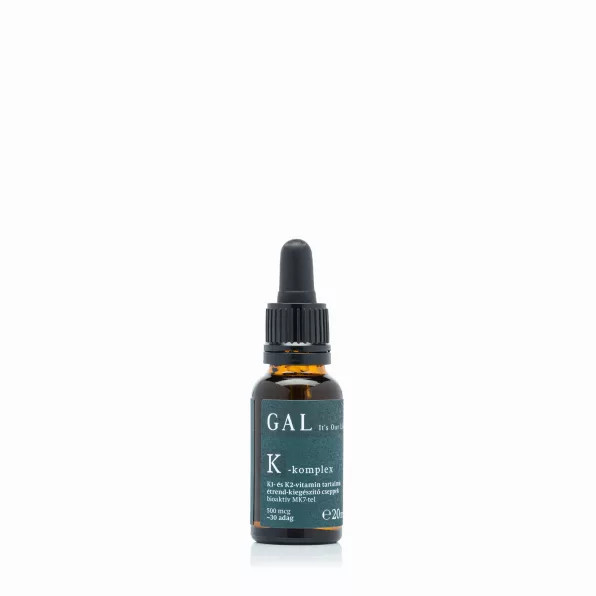Produsul nostru conține ingredientele active în forma lor naturală (vitamina K1 și varianta bioactivă MK-7 a vitaminei K2, fără alergeni din soia) dizolvate în ulei MCT obținut din ulei de palmier și cocos certificat RSPO („prietenos cu urangutanii”) pentru a asigura absorbția și stabilitatea adecvată. (Unele produse conțin forma „cis-” a K2 MK-7, mai puțin eficientă, dar GAL K-complex conține doar forma naturală „trans-”, eficientă.)