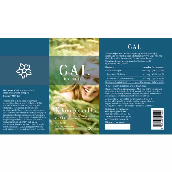 Produsul nostru conține substanțele active în ulei MCT obținut din ulei de palmier și cocos certificat RSPO (sustenabil, „prietenos cu urangutanii”), pentru a asigura absorbția și stabilitatea optimă, în forma lor naturală: vitamina D3, vitamina K1 și vitamina K2 în forma bioactivă MK-7, fără alergeni de soia. (Unele produse conțin forma mai puțin eficientă „cis-” a K2 MK-7, în timp ce GAL K-complex + D3 Forte conține doar forma naturală „trans-”, eficientă.)