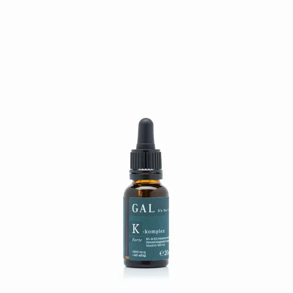 Produsul nostru conține substanțele active în forma lor naturală, K1 și K2 MK-7 bioactiv, dizolvate în ulei MCT obținut din ulei de palmier și nucă de cocos certificat RSPO (sustenabil, „prietenos cu urangutanii”), pentru a asigura absorbția și stabilitatea optimă. (Unele produse pot conține K2 MK-7 în forma mai puțin eficientă „cis”, însă GAL K-complex Forte conține doar forma naturală „trans”, eficientă.)