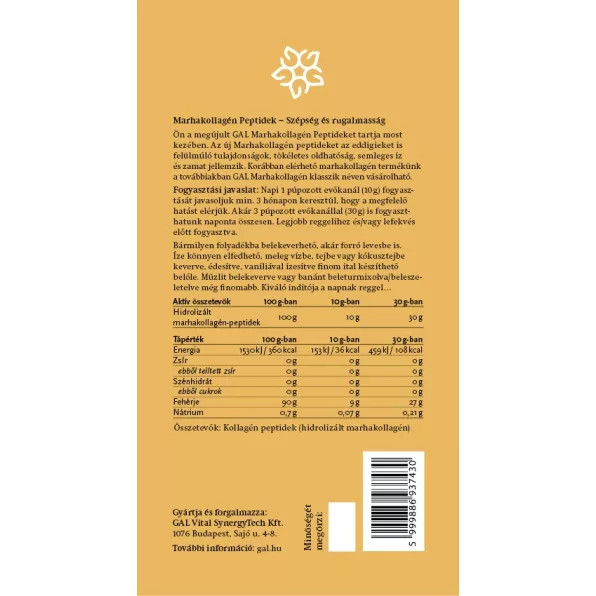 Peptidele de colagen bovin GAL se remarcă prin proprietăți superioare față de produsele anterioare: solubilitate perfectă, gust neutru și aromă plăcută. Dimensiunea peptidelor sub 3000 Dalton oferă o bioactivitate excepțională și o absorbție rapidă și completă în organism. Pe lângă susținerea generală a sănătății, consumul zilnic al acestui produs este foarte convenabil, pulberea fină, cu gust neutru, se dizolvă ușor în orice băutură sau chiar în alimente, fără a forma cocoloașe. Pentru a obține efectele așteptate de la colagenul de tip I, se recomandă în continuare consumul zilnic de 10 grame.