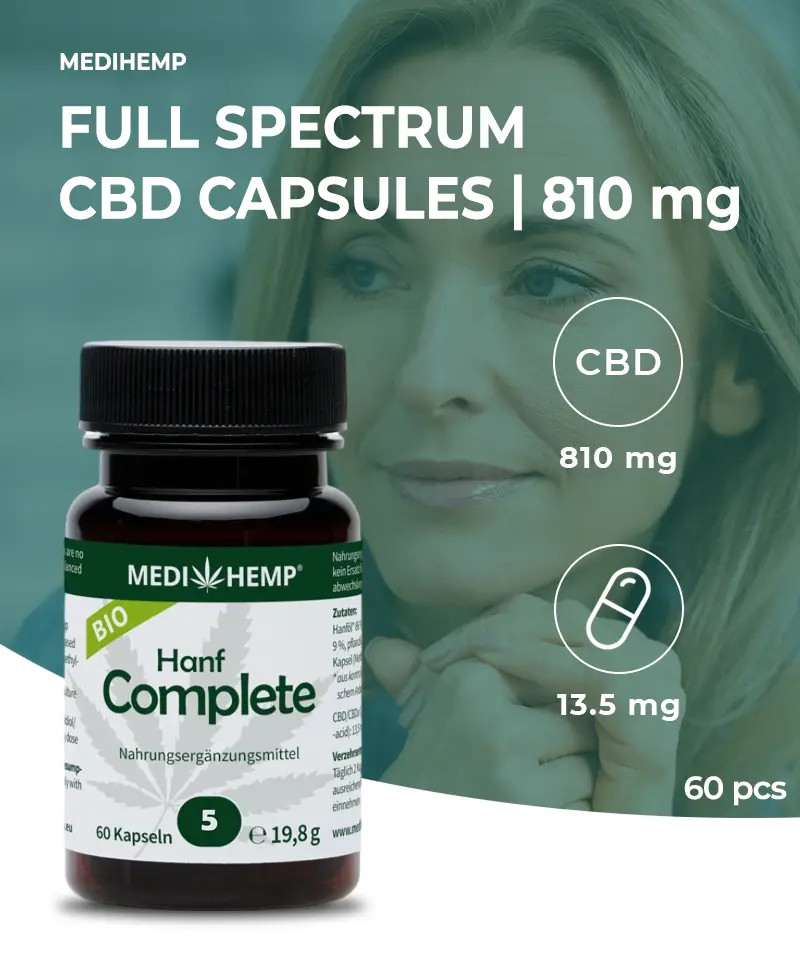 Linia de capsule Medihemp Complete CBD este populară printre cei care preferă mai puțină aromă de ulei CBD sau sunt doar în căutarea unei opțiuni mai convenabile. Cutia vine cu 60 de capsule Medihemp CBD la o concentrație de 5%, ceea ce face ca doza zilnică de CBD să fie foarte ușoară. O capsulă conține 13,5 mg de CBD, dar produsul conține și o serie de alte canabinoide, terpene și alte ingrediente active valoroase.