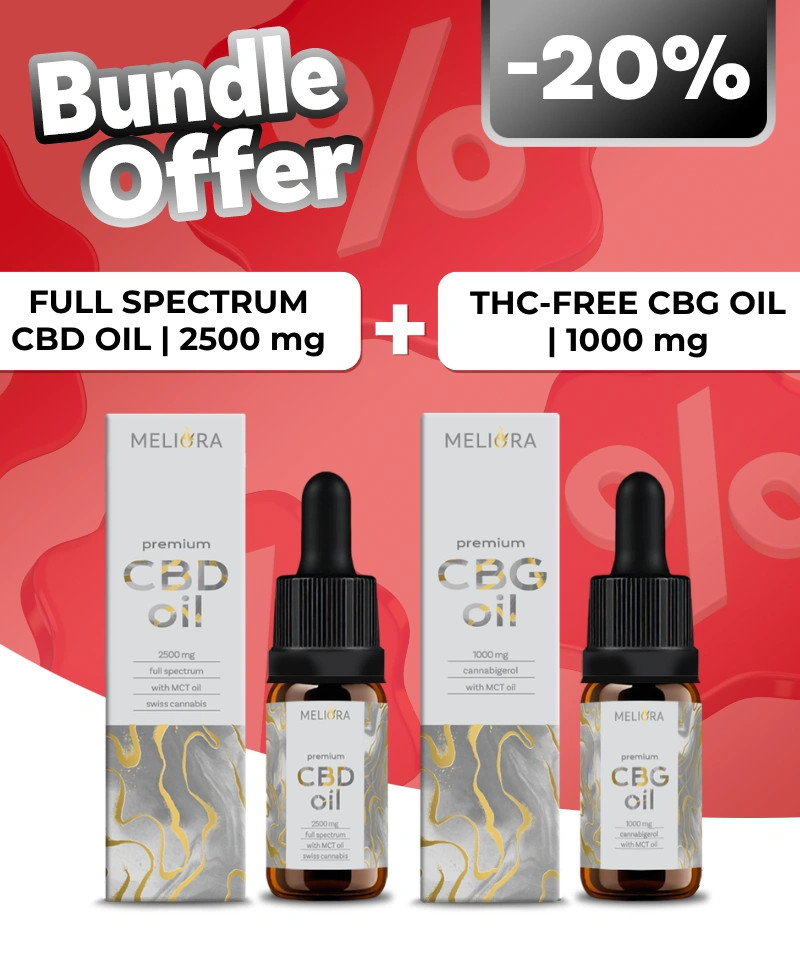 Meliora 25%-os CBD olaj és 10%-os CBG olaj egy kedvezményes csomagban